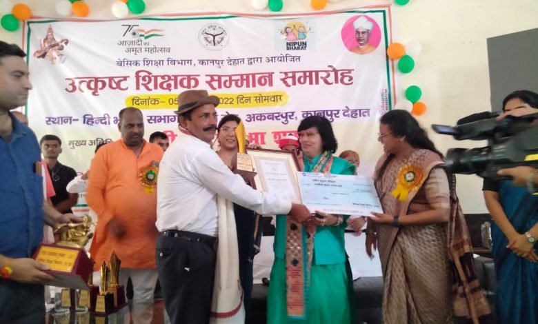 रूरा कानपुर देहात _ भारत से लेकर भूटान तक बेसिक शिक्षा विभाग में अध्ययनरत बच्चों को खेल स्पर्धा में दक्षिण एशियाई देशों के मध्य भूटान से स्वर्ण पदक जिताकर लाने वाले उच्च प्राथमिक विद्यालय सिठमरा के सहायक अध्यापक नवीन कुमार दीक्षित को उत्तर प्रदेश सरकार का शिक्षा क्षेत्र में दिया जाने वाला सर्वोच्च पुरस्कार राज्य अध्यापक पुरस्कार हिंदी भवन में अकबरपुर में प्रदान किया गया