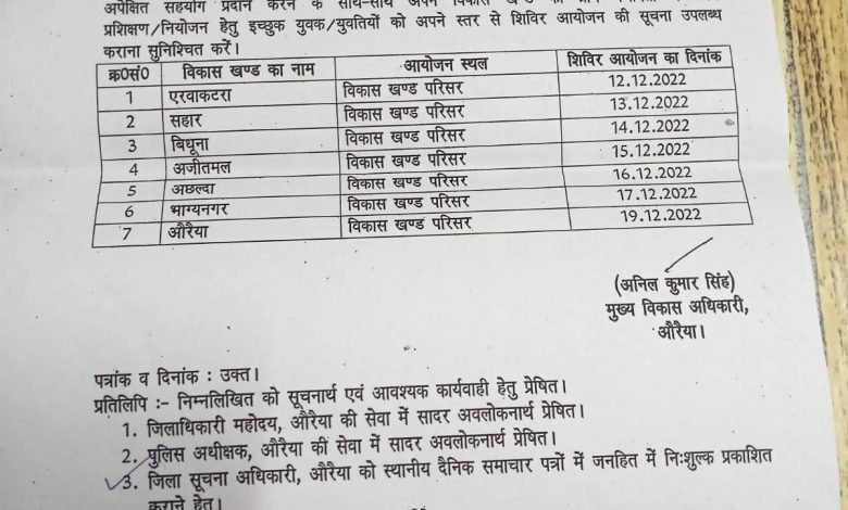 औरैया 21 नवंबर 2022– मुख्य विकास अधिकारी अनिल कुमार सिंह ने अवगत कराया है कि भारतीय सुरक्षा दक्षता परिषद नई दिल्ली एवं एसआईएस लिमिटेड के संयुक्त तत्वधान में सुरक्षा कार्यों के लिए आवेदित उम्मीदवारों को पंजीकृत कर प्रशिक्षणोपरान्त स्थाई रोजगार देने के लिए विकासखंडवार शिविर आयोजित किए जाएंगे। जिसमें 12 दिसंबर को विकासखंड परिसर एरवाकटरा, 13 दिसंबर को विकासखंड परिसर सहार, 14 दिसंबर को विकासखंड परिसर बिधूना, 15 दिसंबर को विकासखंड परिसर अजीतमल, 16 दिसंबर को विकासखंड परिसर अछल्दा, 17 दिसंबर को विकासखंड परिसर भाग्यनगर और 19 दिसंबर को विकासखंड परिसर औरैया में शिविर का आयोजन किया जाएगा। उन्होंने समस्त खंड विकास अधिकारी को निर्देशित किया हैं कि विकास खंडवार आयोजित होने वाले शिविर हेतु कोविड-19 के मानकों का अनुपालन करते हुए संस्था को अपेक्षित सहयोग प्रदान करने के साथ-साथ अपने विकासखंड की ग्राम पंचायतों में उक्त प्रशिक्षण/नियोजन के लिए इच्छुक युवक-युवतियों को अपने स्तर से शिविर की सूचना उपलब्ध कराना सुनिश्चित करें।