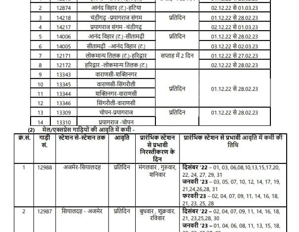रेल प्रशासन द्वारा कोहरे के मौसम 2022-23 के दृष्टिगत निम्न गाड़ियों का पूर्ण निरस्तीकरण एवं आवृति में कमी करने का निर्णय लिया गया है
