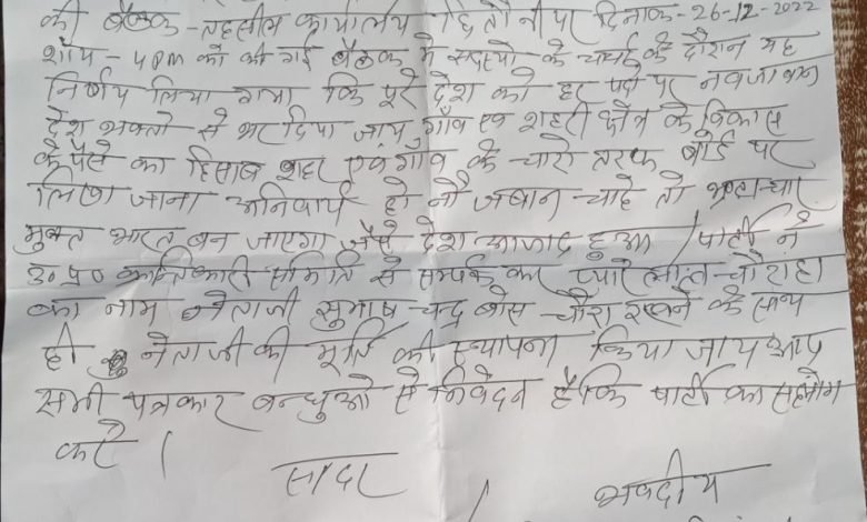 रसडा़( बलिया )राजनीतिक पार्टी आजाद हिंद फोर्स की एक आवश्यक बैठक पार्टी के संस्थापक/अध्यक्ष रणजीत सिंह की अध्यक्षता में तहसील कार्यालय छितौनी रसड़ा पर सोमवार को सायं सकुशल संपन्न हुई। बैठक में शासन से मांग की गई की ग्रामीण क्षेत्रों तथा शहरी क्षेत्रों में हुए विकास कार्यों में किए गए धन खर्च का विवरण बोर्ड लगाकर सार्वजनिक किए जाएं।रिक्त पदों पर नौजवानों की नियुक्ति तत्काल की जाय और रसडा़ के प्यारेलाल चौराहे पर नेता जी सुभाष चंद्र बोस की प्रतिमा लगाई जाए।बैठक मे सभी सदस्यों ने अपने अपने विचार व्यक्त किये। अगले बैठक में भ्रष्टाचार के विरूद्ध संघर्ष के लिए नई रणनीति बनाकर आंदोलन किया जाएगा राष्ट्रीय अध्यक्ष के इस वक्तव्य के साथ पार्टी की बैठक समाप्त हुई।