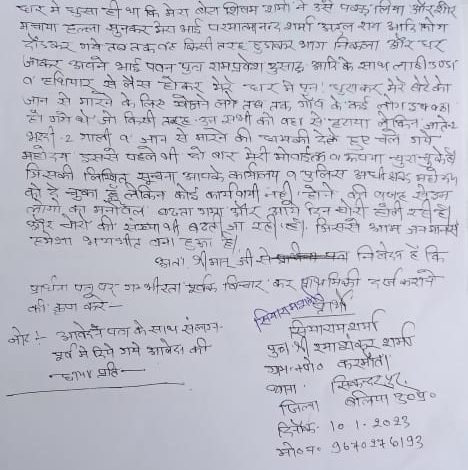 कि नवंबर 2021 को भी उनके घर में से चोरों द्वारा मोबाइल सहित नगदी उठा लिया गया था। जिसकी सूचना पुलिस को लिखित रूप में दी गई थी। लेकिन पुलिस की कोई कार्रवाई नहीं करने का नतीजा की सोमवार की रात्रि चोरों द्वारा चोरी का दोबारा प्रयास किया गया। लेकिन परिजन व ग्राम वासियों के जागने की वजह से चोर चोरी करने में विफल रहे। जिसकी तहरीर थाने पर देते हुए सियाराम शर्मा ने न्याय एवं सुरक्षा की गुहार लगाया हैं।इस बाबत एस एच ओ सिकंदरपुर दिनेश पाठक ने बताया कि घटना की सूचना मिली है जिसको हल्का दरोगा को जांच का आदेश दे दिया गया है जांच उपरांत उचित कार्रवाई की जाएगी।