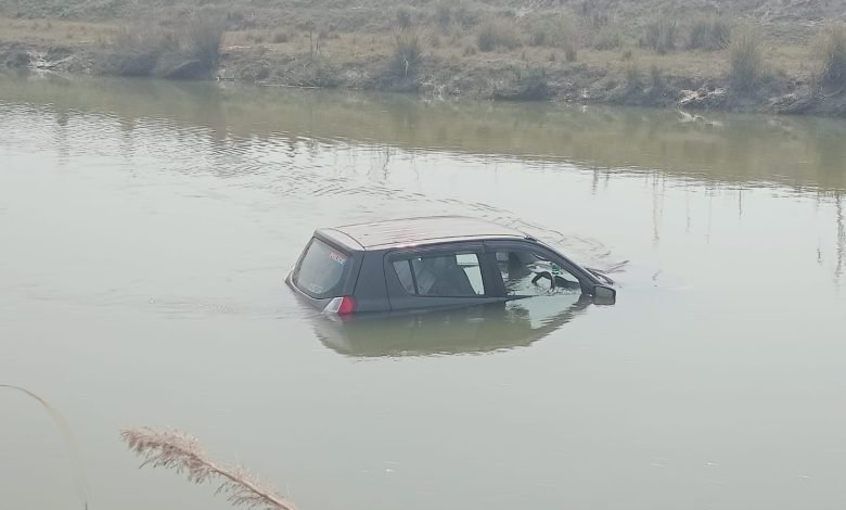 अनियंत्रित हुई कार पानी भरी नहर में गिरी कार सवार दंपति बाल बाल बचे