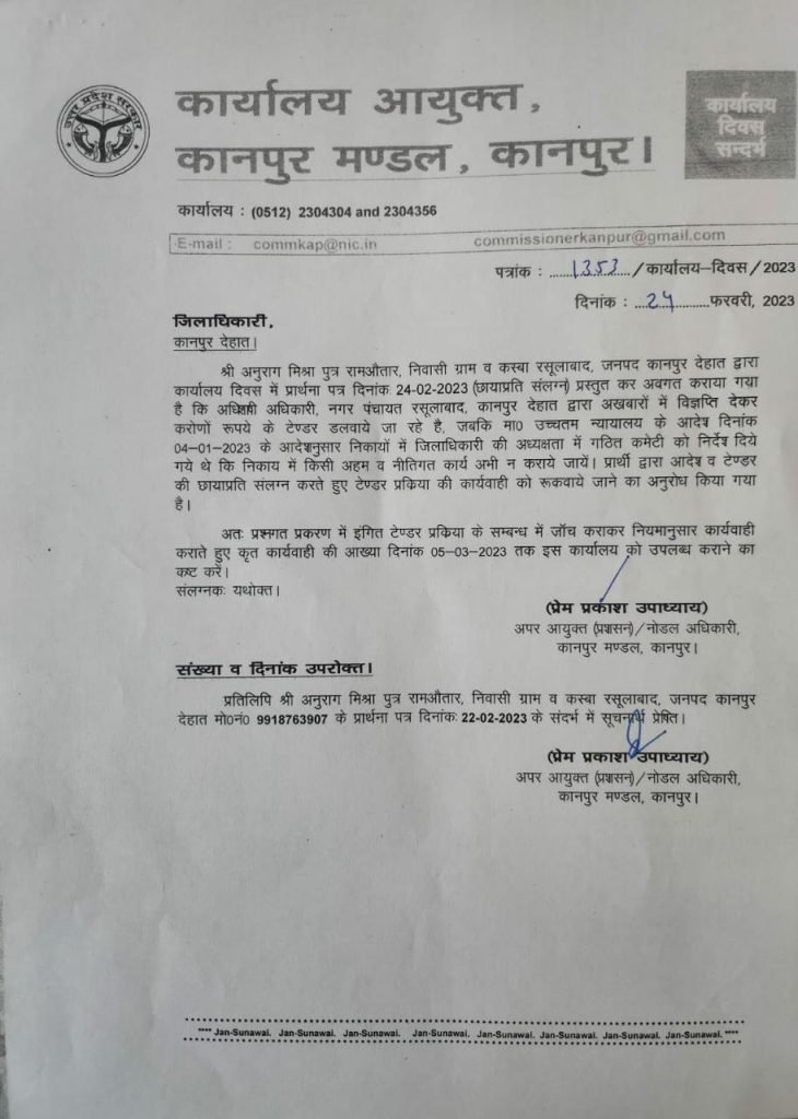 कार्यालय आयुक्त , कानपुर मण्डल, में शिकायतकर्ता अनुराग मिश्रा पुत्र रामऔतार, निवासी ग्राम व कस्बा रसूलाबाद जनपद कानपुर देहात ने कार्यालय दिवस में प्रार्थना पत्र दिनांक 22-02-2023 (छायाप्रति संलग्न) प्रस्तुत कर अवगत कराया गया है। कि अधिशाषी अधिकारी,दिनेश कुमार शुक्ला नगर पंचायत रसूलाबाद,कानपुर देहात द्वारा उच्चतम न्यायालय के आदेश दिनांक 04-01-2023 के क्रम में 09 दुकानों को बिना टेंडर के बनवायी जा रही है तो वही करोड़ों रुपये के टेंडर प्रक्रिया कराकर उच्चतम न्यायालय के आदेशों की अवहेलना की जा रही है। शिकायतकर्ता द्वारा उच्चतम न्यायालय द्वारा पारित आदेश के अनुपालन में बिना टेंडर से बनवायी जा रही मार्केट को रोके जाने एवं गठित तीन सदस्यीय कमेटी की उपस्थिति में टेंडर रोकने का अनुरोध किया गया है।