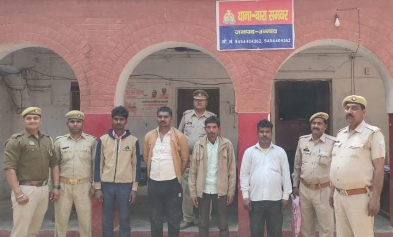 उन्नाव तहसील बीघापुर पाटन बारासगवर युवक के साथ मारपीट करने वाले चार अभियुक्तों को गिरफ्तार किया गया।संक्षिप्त विवरण- दिनांक 09.03.2023 की रात्रि में ग्राम मलुहाखेडा में अराजक तत्वों द्वारा युवक विकास उर्फ सुरेश पुत्र मेडीलाल के साथ गाली गलौज करते हुए जान से मारने की नियत से हमला कर लाठी डंडो से पीट पीट कर मरणासन्न कर देने एवं मौके से फरार हो जाने तथा दिनांक 10.03.2023 को मज़रूब विकास उर्फ सुरेश उपरोक्त के पिता मेडीलाल की तहरीरी सूचना के आधार पर थाना स्थानीय पर मु0अ0स0 32 / 23 धारा 307/308/323/504 भा0द0वि0 पंजीकृत किया गया। आज दिनांक 11.03.2023 को 1. गेंदालाल पुत्र आल्हा उर्फ सुखराम उम्र 23 वर्ष निवासी ग्राम मलुहाखेडा थाना बारासगवर जनपद उन्नाव 2. बिरजू उर्फ विजयपाल पुत्र आल्हा उर्फ सुखराम उम्र 41 वर्ष निवासी ग्राम मलुहाखेडा थाना बारासगवर जनपद उन्नाव 3. अरुण पुत्र सन्तू उम्र 28 वर्ष निवासी ग्राम मलुहाखेडा थाना बारासगवर जनपद उन्नाव 4. सुरेश पुत्र चन्द्रिका उम्र करीब 58 वर्ष निवासी ग्राम मलुहाखेडा थाना बारासगवर जनपद उन्नाव को गिरफ्तार किया गया।गिरफ्तार अभियुक्तगण का विवरण-1. गेंदालाल पुत्र आल्हा उर्फ सुखराम उम्र 23 वर्ष निवासी ग्राम मलुहाखेडा थाना बारासगवर जनपद उन्नाव2. बिरजू उर्फ विजयपाल पुत्र आल्हा उर्फ सुखराम उम्र 41 वर्ष निवासी ग्राम मलुहाखेडा थाना बारासगवर जनपद उन्नाव 3. अरुण पुत्र सन्तू उम्र 28 वर्ष निवासी ग्राम मलुहाखेडा थाना बारासगवर जनपद उन्नाव
