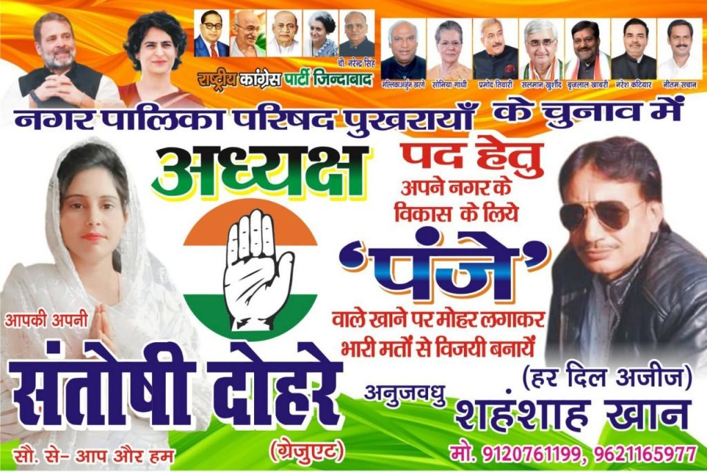 कस्बा पुखरायां नगर पालिका चुनाव में कांग्रेस के प्रत्याशी संतोषी के द्वारा घर-घर दस्तक देकर आशीर्वाद प्राप्त किया जा रहा है।