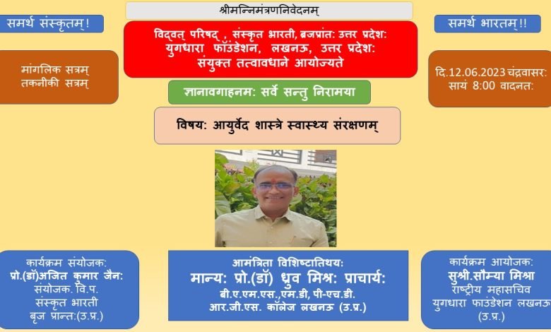 विश्व रक्तदान दिवस के पूर्व आरोग्य प्राप्ति हेतु विद्वत परिषद संस्कृत भारती बृज प्रांत उत्तरप्रदेश एवं युगधारा फाउंडेशन उत्तरप्रदेश के संयुक्त तत्वाधान में आयोजित सर्वे संतु निरामया की भावना से परिपोषित आयुर्वेद शास्त्रे स्वास्थ्य संरक्षण्म के विषय पर विचार संगोष्ठी का गूगल मीट पर ऑनलाइन आयोजन किया गया जिसमें सारसस्वत अतिथि के रूप में प्रो (डॉ) ध्रुव मिश्र प्राचार्य एवं निदेशक आरजीएस आयुर्वेदिक मेडिकल कॉलेज एंड रिसर्च सेंटर लखनऊ उत्तरप्रदेश, का विशेष सानिध्य प्राप्त हुआ। सरस्वती वंदना आगरा से नूतन स्वारिता, मंगलाचरण अलीगढ़ से डॉ जीवन सिंह आर्य , स्वागत गीत प्रस्तुति कारण पीलीभीत से संजीता सिंह जी, स्वागत भाषण सौम्या मिश्रा द्वारा दिया गया। प्रोफेसर मिश्र ने अपने वक्तव्य को समस्त विद्वत जनों को संबोधित करते हुए कहा कि दुःख से पीड़ित समस्त दुखो का हरण हो यही आयुर्वेद का मूल मंत्र है। उन्होंने आ नो भद्राः क्रतवो यंतु विश्वत अर्थात उन विचारों को ग्रहण करना चाहिए जोकि समस्त विश्व के लिए कल्याणकारी हो। स्वस्थ रहने के लिए स्वास्थवृत्त के नियमों का पालन करना चाहिए। एक अच्छा और उत्तम जीवन जीने के लिये चिंता विहीन जीवन जीने का प्रयास करना चाहिए। चिंता से जुड़ी व्याधियों पर विस्तृत चर्चा करते हुए प्रोफेसर मिश्र द्वारा प्रीवेंटिव मैथड के तरीके पर प्रकाश डाला जिसमें 90 के दशक में आई आधुनिक तकनीकियों ने रोगों के बारे में तो बताया किंतु उन्होंने रोगियों को रोग से तड़पने के लिए छोड़ दिया। प्रोफेसर मिश्र ने कोरोना को आयुर्वेद का सबसे अच्छा मित्र बताया है, क्योंकि विश्व स्तर पर कोरोना केकॉल में ही आयुर्वेद को वृहद रूप में पहचान मिली। कार्यक्रम का संचालन डॉ अजित जैन व आभार प्रदर्शन डॉ रामकृष्ण सहस्रबुद्धे द्वारा किया गया।