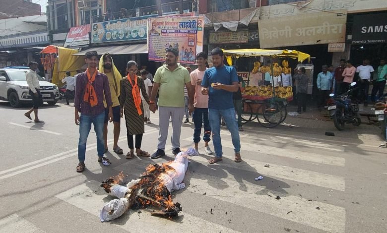 विभाग संयोजक दिव्यांशु सिसोदिया के नेतृत्व में पंश्चिम बंगाल की मुख्यमंत्री ममता बनर्जी का पुतला फूंका
