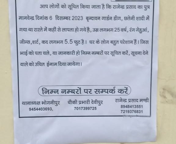 वाला लड़का मानवेंद्र पुत्र श्री राजेन्द्र प्रसाद जिसकी उम्र लगभग 25 वर्ष, रंग गेहुंआ, कद लगभग 5 फुट5 इंच और कपड़ा जीन्स शर्ट पहने हुए है।वह घर से दावत खाने के लिए 6/12/2023 को वृन्दावन गार्डन डींघ, छतेनी शादी में गया था वहीं से या रास्ते से कहीं लापता हो गया है।