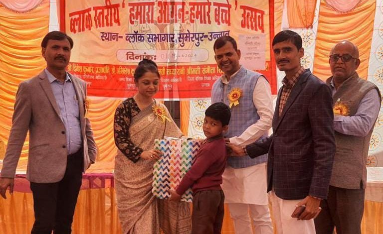 उन्नाव आज दिनाँक 01 मार्च 2024 दिन शुक्रवार को मानव संसाधन केंद्र सुमेरपुर जनपद उन्नाव के प्रांगण में हमारा आँगन ,हमारे बच्चे कार्यक्रम मुख्य अतिथि खंड विकास अधिकारी श्रीमती संध्या रानी अतिथि सहायक खंड विकास अधिकारी हरिओम तिवारी,व खंड शिक्षा अधिकारी अखिलेश वर्मा के साथ आंगनवाड़ी सुपरवाइजर श्रीमती संगीता ,मंजू, मंजुलता जी के साथ प्राथमिक शिक्षक संघ के ब्लॉक अध्यक्ष श्री विनोद सिंह के साथ एआरपी लोकेश मिश्रा, आशेन्द्र सिंह जी तथा रवी शंकर पांडे जी के द्वारा विकास खंड में निपुण छात्र छात्राओं को सम्मानित किया गया।कार्यक्रम का शुभारंभ खंड विकास अधिकारी श्रीमती संध्या रान अखिलेश वर्मा खंड शिक्षा अधिकारी तथा विनोद सिंह अध्यक्ष के द्वारा दीप प्रज्जवलन कर किया गया। उच्च प्राथमिक विद्यालय सुमेरपुर तथा कंपोजिट विद्यालय पाटन के छात्र-छात्राओं द्वारा सरस्वती वंदना व स्वागत गीत प्रस्तुत किया गया ।कार्यक्रम में विकासखंड के 15 न्याय पंचायत में निपुण हुए पांच पांच छात्र-छात्राओं को शैक्षिक अधिगम सामग्री भेंट कर उनका उत्साह वर्धन व स्वागत किया गया ।कार्यक्रम क बाल वाटिका प्रभारी आंगनवाड़ी तथा विद्यालय के प्रधानाध्यापक को नोडल मानते हुए किया गया ।बाल वाटिका में बालक का प्रवेश 3 वर्ष की आयु में हो जाता है तथा 6 वर्ष की आयु पूर्ण होने पर प्राथमिक विद्यालय में प्रवेश दिलाया जाता है। हमारे बच्चे हमारा आंगन के नाम से संचालित इस कार्यक्रम में बाल वाटिका तथा प्राथमिक विद्यालय के अध्यापक संयुक्त रूप से सतत प्रयास करते हुए छात्र छात्रों को शासन तथा विभाग द्वारा निर्धारित लक्ष्य के अनुरूप निपुण छात्र बनाते हैं ।कार्यक्रम में मुख्य अतिथि श्रीमती संध्या रानी जी द्वारा अपने संबोधन में कहा गया की नौनिहाल बालको की देखरेख व टीकाकरण के साथ प्रारंभिक अअक्षर ज्ञान की शुरुआत आंगनवाड़ी में बाल वाटिका के रूप में होती है तथा विद्यालय में प्रवेश के उपरांत निर्धारित पाठ्यक्रम के अनुसार उसकी शिक्षा प्रारंभ होती है इस प्रकार से बालक बाल वाटिका में अपने घर आंगन जैसा माहौल व अन्य बच्चों के साथ घुलने मिलने में सहज हो जाता है तथा उसका विकास उसकी अवस्था के अनुरूप प्रारंभ हो जाता है। हमारे बच्चे हैं हमारे घर की रोशनी है इनके शिक्षित होने से हमारे समाज जनपद प्रदेश और देश का चौमुखी विकास संभव होगा। कार्यक्रम में आंगनबाड़ी की ब्लॉक कोऑर्डिनेटर श्रीमती प्रीति ने आंगनवाड़ी में नामांकित बच्चों को मिल रही सुविधाओं व पोषण योजना की विस्तृत जानकारी दी। साथ ही श्री विनोद सिंह अध्यक्ष प्राथमिक शिक्षक संघ ब्लॉक इकाई सुमेरपुर ने आंगनबाड़ी कार्यकर्ताओं व शिक्षकों के किए जा रहे हैं प्रयासों की सराहना करते 