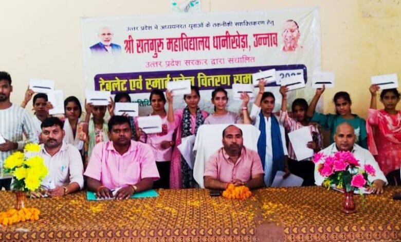 उन्नाव बीघापुर तहसील थाना बारा सगवर क्षेत्र के गांव धानीखेड़ा स्थित सतगुरु महाविद्यालय में बुधवार को 130 छात्र छात्राओं को टेबलेट वितरित किए गए। टेबलेट पाकर छात्र छात्राओं के चेहरे खिल उठे।