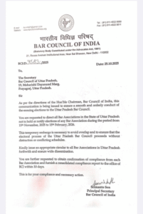 BCI ने उत्तर प्रदेश की राज्य-स्तरीय बार काउंसिल तथा सभी जिला-और स्थानीय बार एसोसिएशनों के चुनाव 15 नवंबर 2025 से 15 फ़रवरी 2026 के बीच स्थगित करने का निर्देश दिया है।